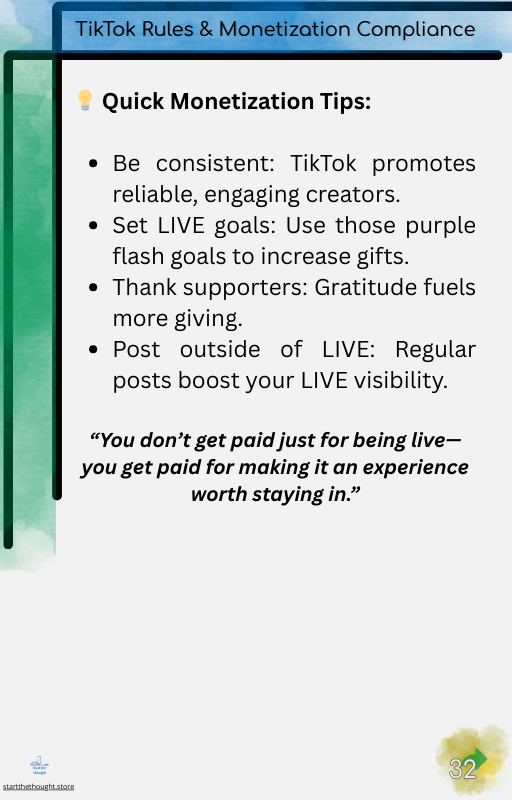 • Monetize your energy, skills, or brand through TikTok Live without feeling salesy.