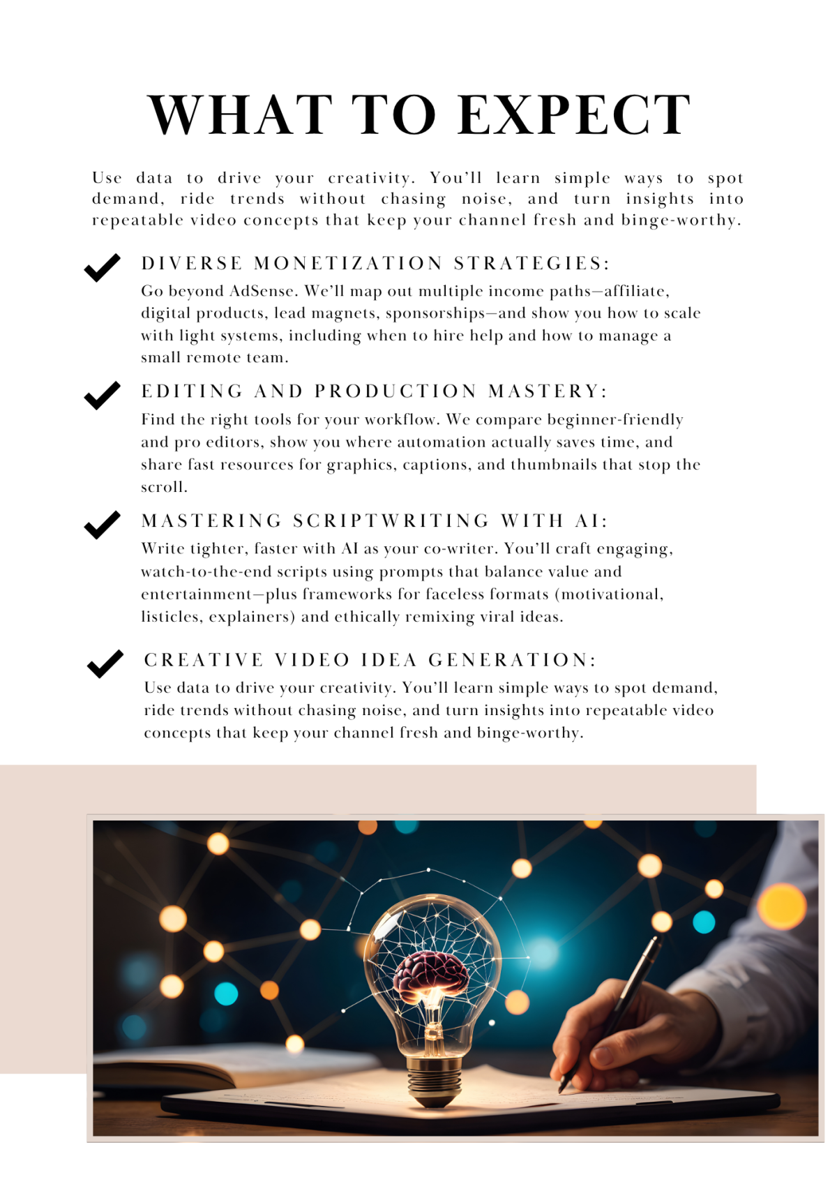 Category: Influencer Marketing | Resell Rights Business | Side HustlesLaunch a faceless YouTube channel without burning out—or showing your face. Faceless YouTube Blueprint: AI Automation Starter Pack gives you the exact system to plan, script, edit, and publish in a repeatable 90-minute loop. It’s clean, realistic, and GenX-friendly (aka no hype, just steps).