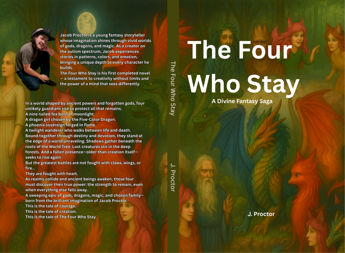 A breathtaking world of gods, dragons, phoenixes, and chosen destiny — created through the vivid, pattern-rich mind of young author Jacob Proctor. This is more than a novel… it is a universe built with heart, courage, and unshakable creativity.