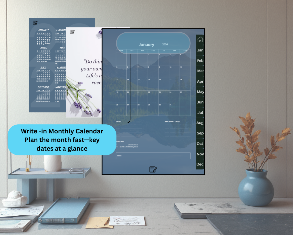 12 Monthly Calendar pages (Jan–Dec 2026) with dedicated sections for Tasks, Holidays, Memo, and Important Dates