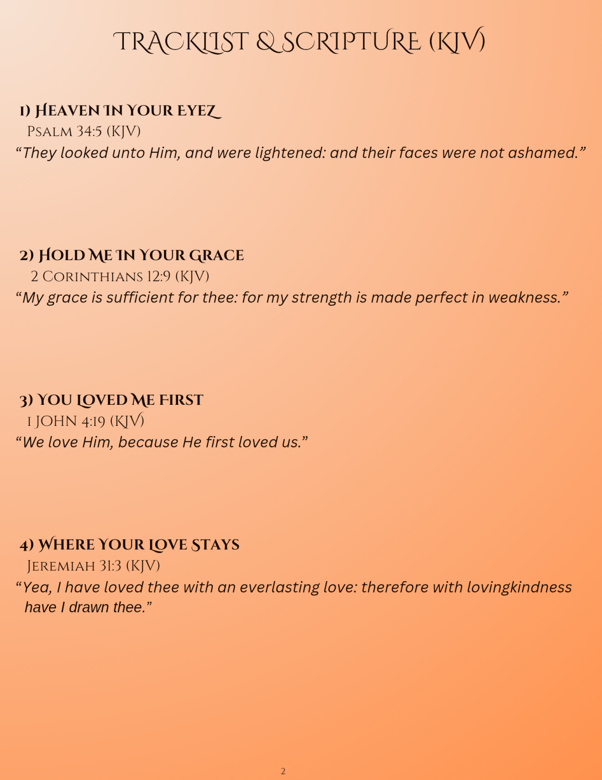 As you listen and read, this faith-based worship album is designed to help quiet your mind, strengthen your faith, and remind you of God’s presence in every season. The music and booklet work together to encourage reflection, prayer, and spiritual grounding.