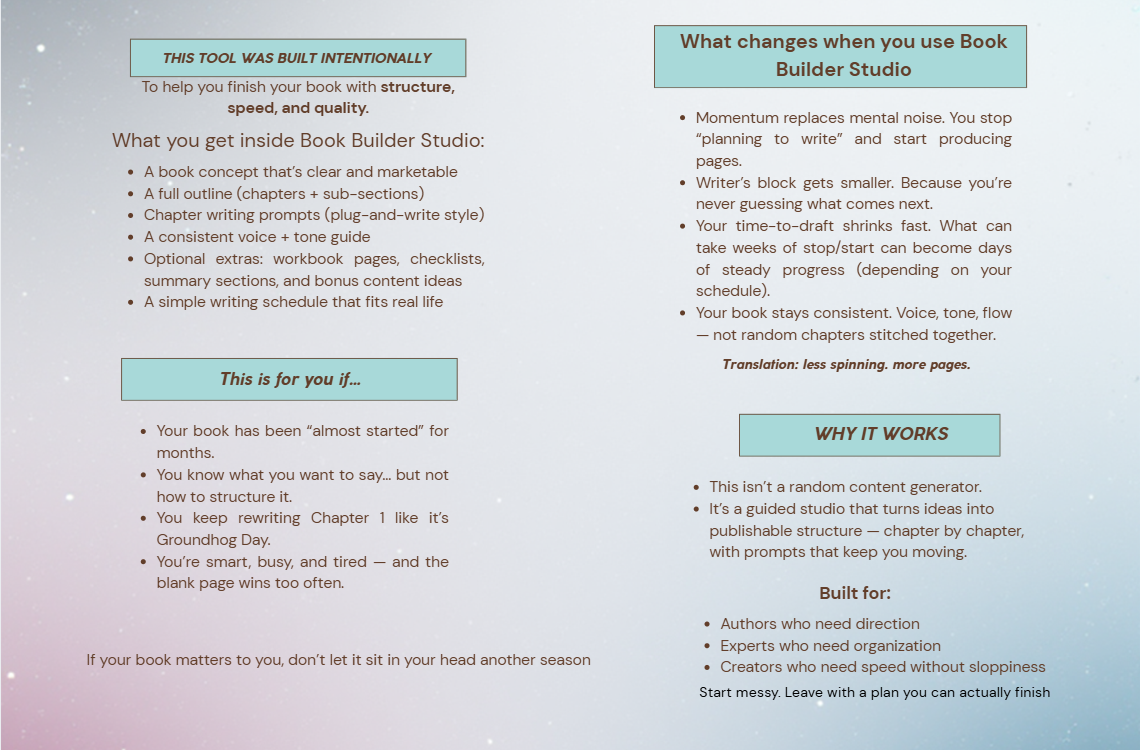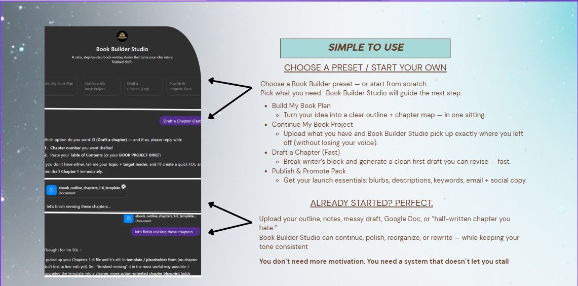Book Builder Studio is a structured ChatGPT ebook writing assistant, not an automatic ghostwriter.